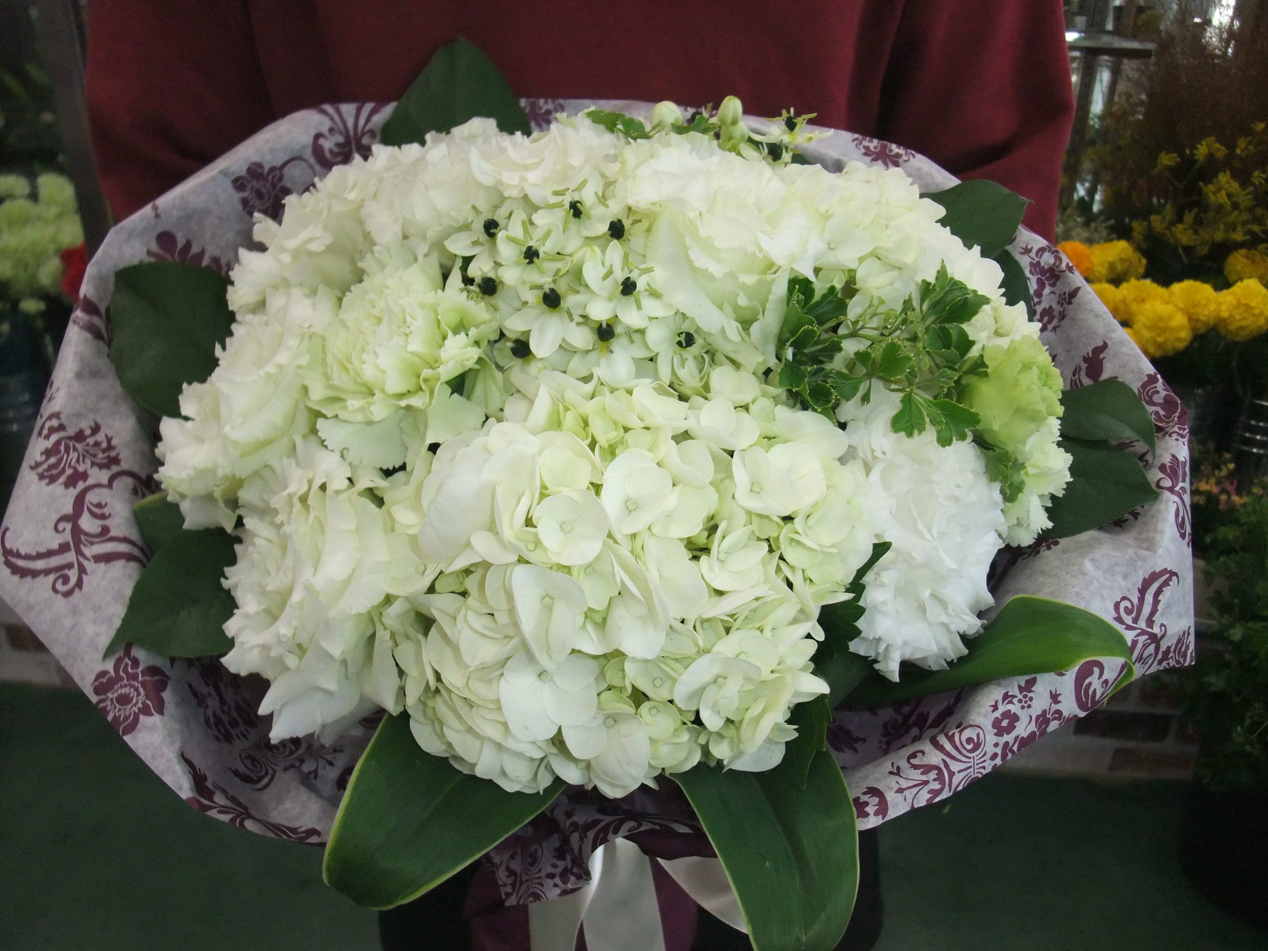 花材は、トルコキキョウ、アジサイ、オーニソガラム、カーネーション、グリーンです(^^)/
