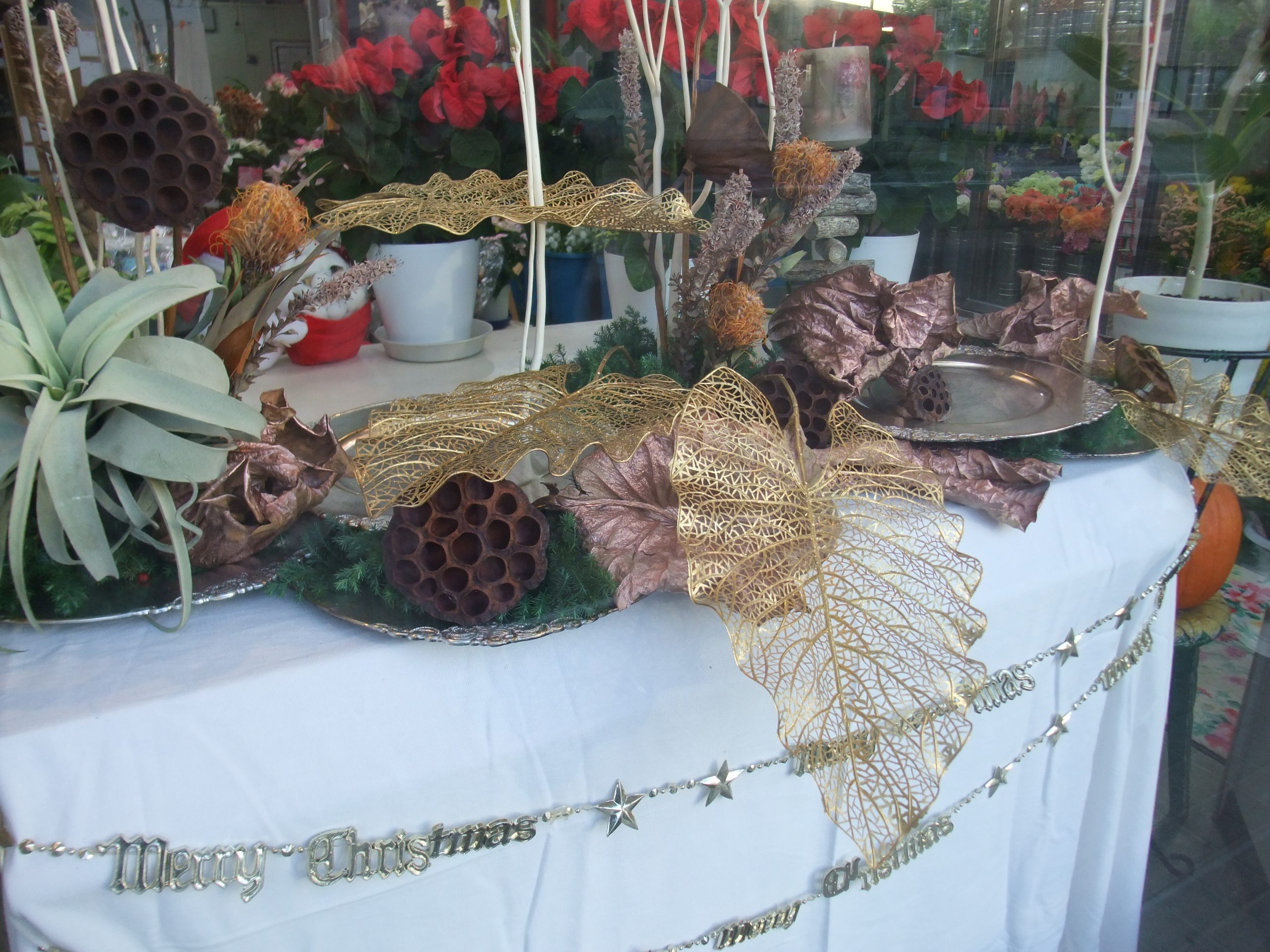 ウインドウの上はヒムロ杉のガーランドに